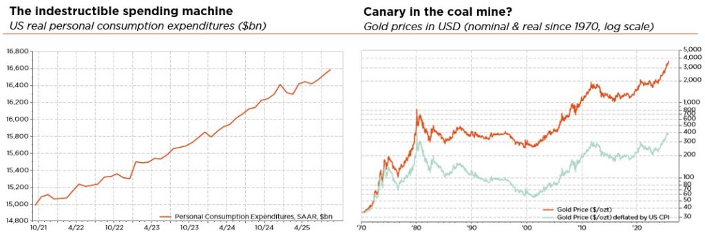 In this highly supportive environment, risk premia and volatility have compressed further toward the lower end of historical ranges. Meanwhile, long-term global rates have stabilised somewhat, although concerns remain – more or less visible depending on the economy – about the sustainability of current fiscal and debt trajectories. Against this backdrop, credit continues to outperform duration, with spreads at historically tight levels that leave little margin for error. The US dollar remains weak, weighed down by a softening labour market, lower Fed rates and the Trump administration’s economic policies, while gold has surged to fresh records. Does this gold rally constitute the proverbial canary in the coal mine? Or simply a “normal” response to elevated geopolitical risks and latent threats (recession, a resurgence of inflation, rate shocks, or currency debasement in a context of fiscal dominance)? Either way, it starkly illustrates the paradox between Main Street and Wall Street.