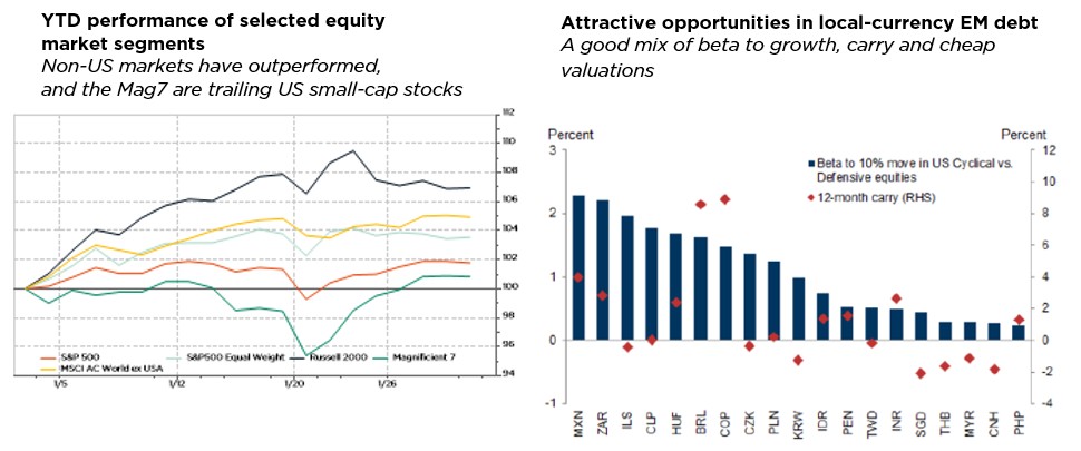2026 began much like 2025: with noise, fury, many moving parts… and, so far, positive market performances. Just one month into the year, a lot has already happened. On the geopolitical front, Venezuela, Iran and Greenland have of course been a focus, alongside President Trump’s speech at the WEF in Davos. In national politics, the Fed’s independence continues to be challenged, the US government may face a shutdown over ICE shootings, the Japanese parliament has been dissolved and France is seeing new budget developments. Economic news include several key US data releases, while financial markets have seen the kick-off of the Q4 earnings season, a spike in gold and silver prices, roaring equity indices (especially outside the US), massive sector/style rotations, new record lows for the USD, and long rate volatility in Japan. I suspect we all desperately need some serenity, but I fear it will not come soon.