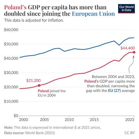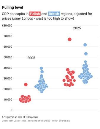 According to an article from the Times (November 2025), 12 out of 17 Polish regions are now richer than West Wales. It has faster internet, cheaper electricity and more high-speed rail than Britain. When it comes to regional development it’s the UK, France and other European major economies, not Poland, that need to catch up now…