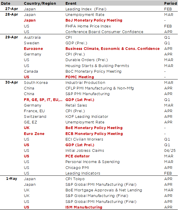 Moving to economic data, the key US releases will include the first estimate of Q1 GDP on Thursday along with the March PCE deflator. The consensus expects real GDP growth at an annualized pace of +2.1% (+0.5% in Q4 2025) and forecasts a +0.3% MoM advance in the core PCE (+0.4% in February), which should push YoY increase to 3.2% from 3.0%. We will get also the Conference Board consumer confidence on Tuesday and the April ISM manufacturing index on Friday (our model forecasts a further increase to 57.1 well above the consensus, which foresees a more modest uptick to 53.0 from 52.7). In Europe, the focus will be the advance Q1 real GDP growth data in the main economies (Thursday), as well as the flash April CPI, with Germany and Spain among countries releasing the data first on Wednesday. To wrap up with corporate earnings, 44% of the S&P500 by market cap is due to report next week, with half of that on Wednesday (Alphabet, Microsoft, Amazon and Meta) and Apple following on Thursday. Earnings will be due from several other important tech firms, but also oil majors such as Exxon, Chevron, BP and Total, and plenty of other industry leaders (Coca, Novartis, Visa, Starbucks, Lilly, CAT, BBVA, Linde).