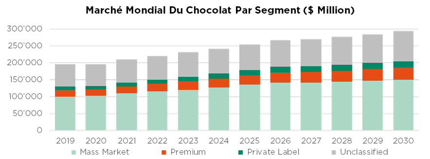 La notion de plaisir coupable réfléchi continue en effet de gagner du terrain, ce dont devraient plutôt profiter les fabricants de chocolat haut de gamme, alors même que leurs concurrents du marché de masse souffrent d’un manque de pouvoir de fixation des prix et de personnalisation des produits. Aujourd’hui, les clients sont prêts à payer plus cher pour des chocolats inédits et singuliers, offrant des saveurs innovantes, des expériences multisensorielles, ainsi qu’un plaisir émotionnel, mieux alignés sur leurs valeurs éthiques et répondant à des exigences à la fois plus saines et plus fonctionnelles. Le segment haut de gamme représente environ 10% du volume du marché mondial de chocolat et 25% de sa valeur. Il affiche une croissance plus rapide (+5 à 7% par an jusqu’en 2030) et génère des rendements supérieurs grâce à un meilleur différentiel entre prix et coût du cacao. Plus spécifiquement, et contrairement à l’industrie des snacks en général, nous estimons que le chocolat haut de gamme est mieux placé pour résister à la pression structurelle exercée par les changements alimentaires des consommateurs et l’adoption de médicaments GLP-1, en supposant des achats certes moins fréquents mais plus sélectifs, ouvrant ainsi la voie à de nouveaux gains de parts de marché.