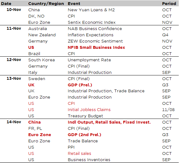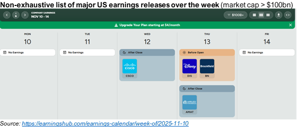 The incoming weeks were expected to be a little quieter in terms of macroeconomic data releases – notably due to the ongoing US government shutdown, which would have continued to delay/prevent the publication of major US economic data such as the CPI and retail sales figures for October this week. However, the end (of the shutdown) seems suddenly near… as some moderate Democrats have voted to advance a bill that will end it. The vote on this bill may happen as soon as today or tomorrow (Tuesday). In this context, there is now more than 90% probability that the shutdown will be over before next week-end, according to Polymarket, with the consequences of being then flooded by a tsunami of delayed data releases once the government reopens.