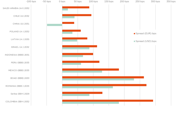 Selected EM debt spreads of equivalent USD and EUR denominated EM sovereign debt