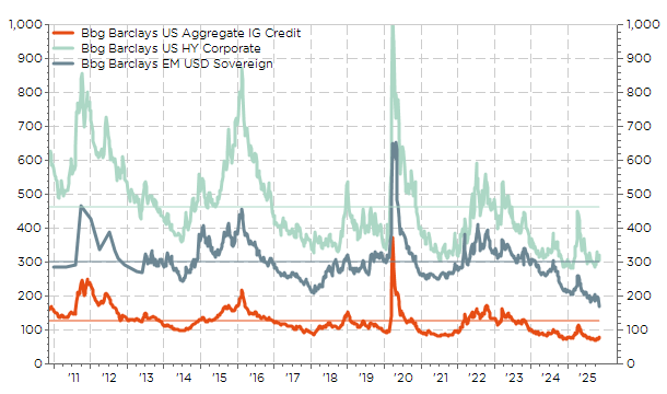 Bloomberg Barclays US IG Credit, HY corporates and EM sovereign debt spreads + their respective averages over the last 15 years